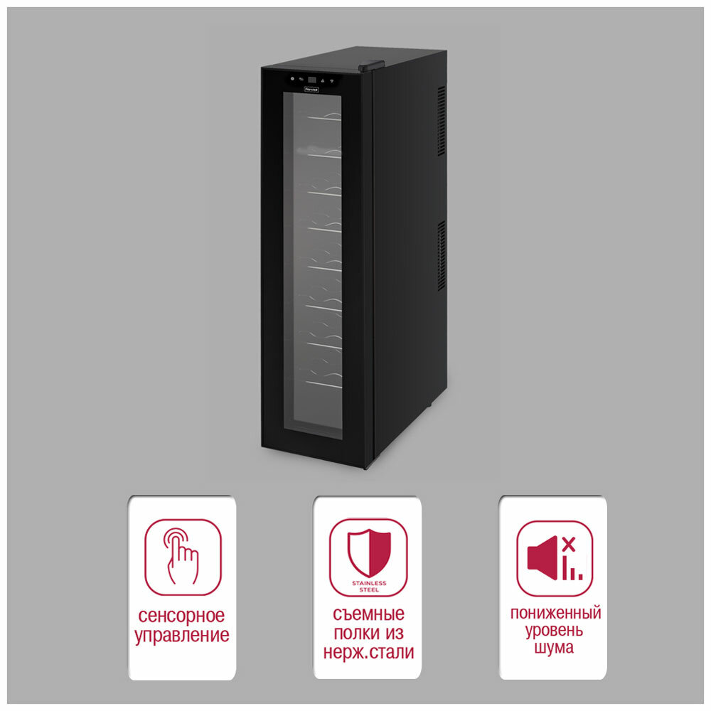 | Плюсы: | дизайн, стоимость, высокая точность поддержания температуры, полностью соответствует требованиям хранения вина |
