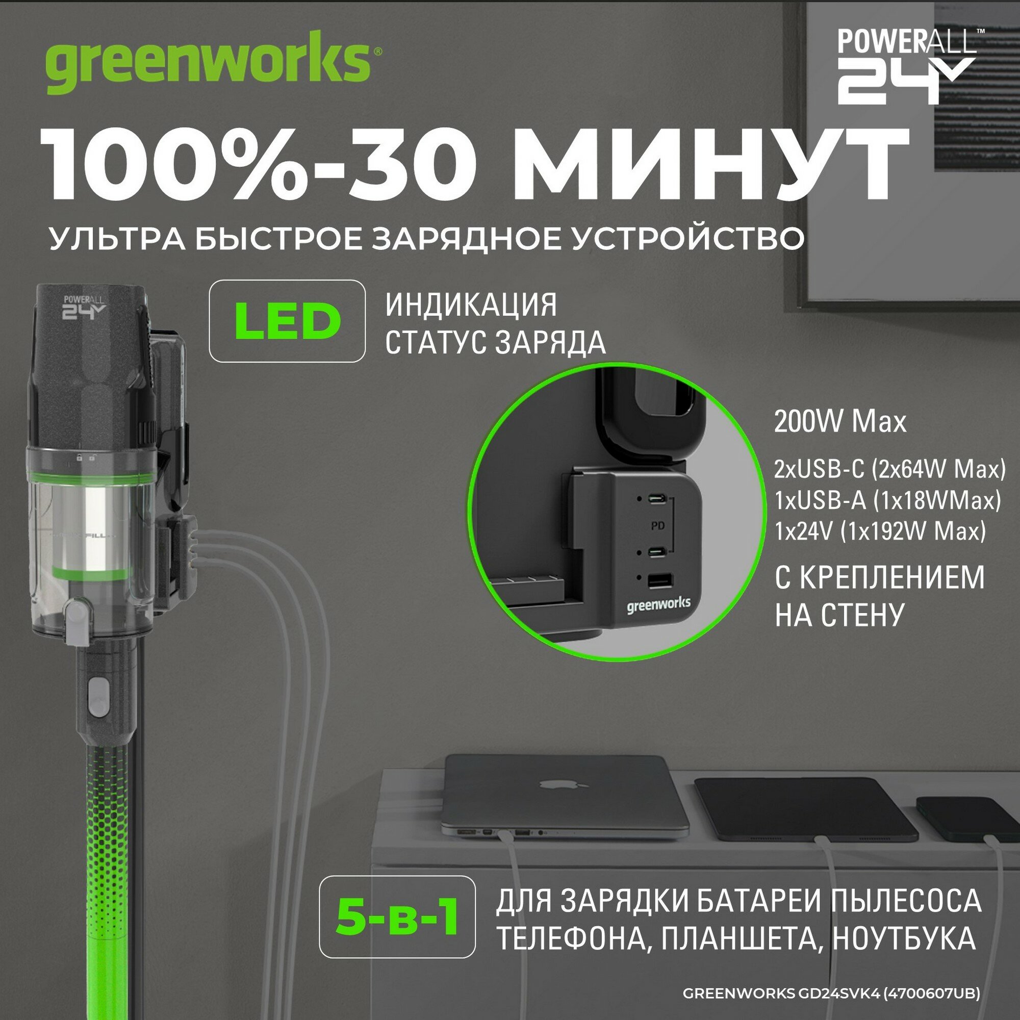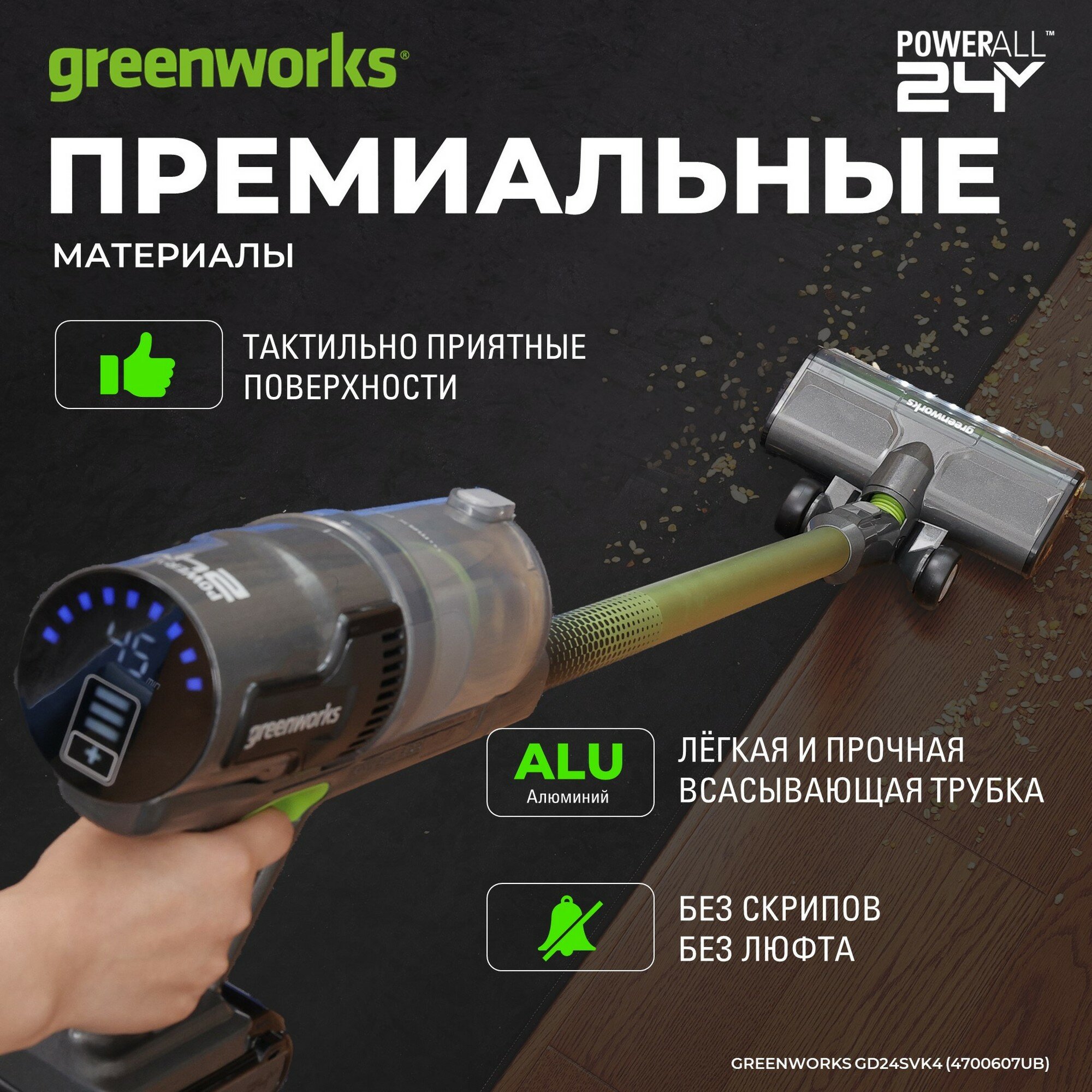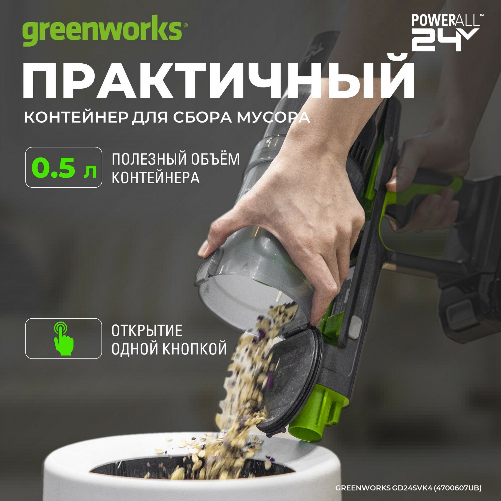 Пылесос беспроводной вертикальный аккумуляторный Greenworks 24В G24SVK4 с АКБ 4 А*ч и ЗУ