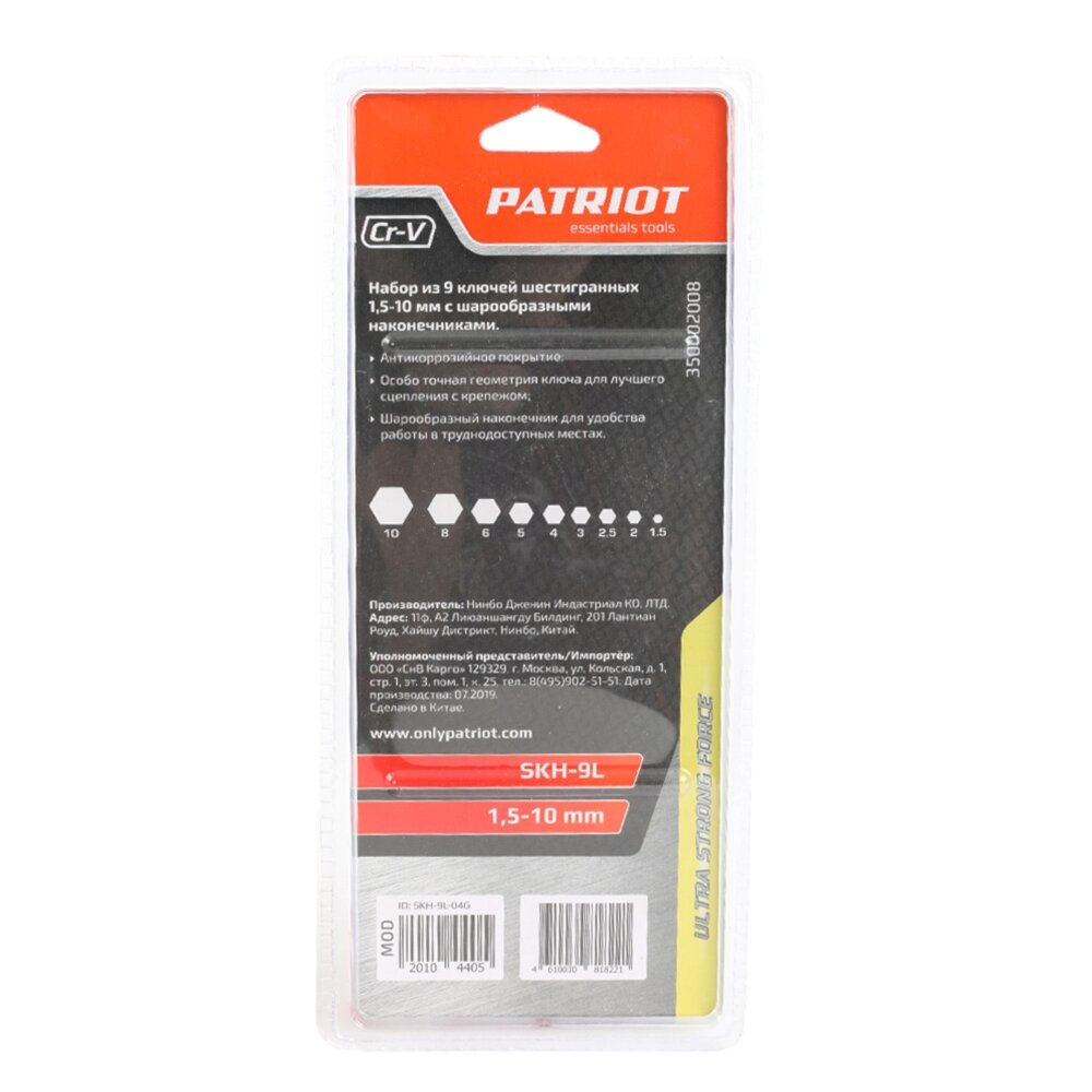Набор ключей PATRIOT SKH-9L, шестигранные с шаром, длинные, 1,5-10мм, CRV, 9 шт 350002008