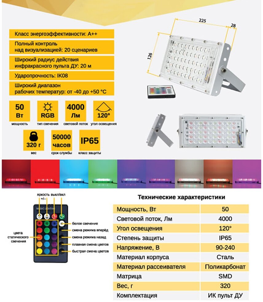 | Дополнительная информация | пульт ДУ в комплекте; 20 режимов работы |