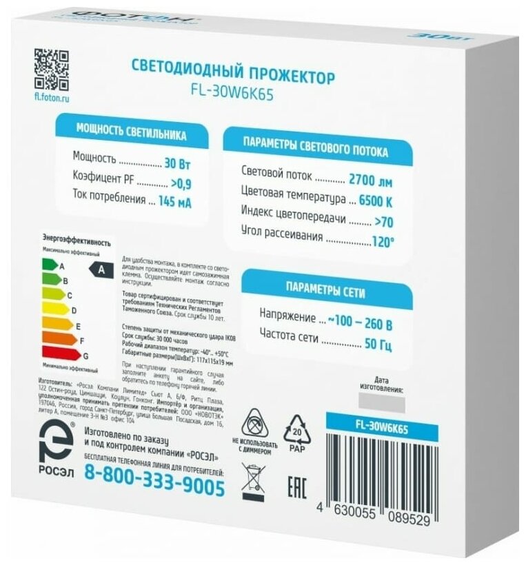 Светодиодный сетевой прожектор фотон FL-30W6K65 30W 24535 интересное: