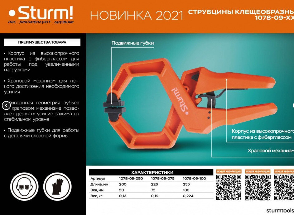 Струбцина клещеобразная Sturm! 1078-09-100 с храповым механизмом, длина 255мм, зев 100мм 1078-09-100 . интересное: