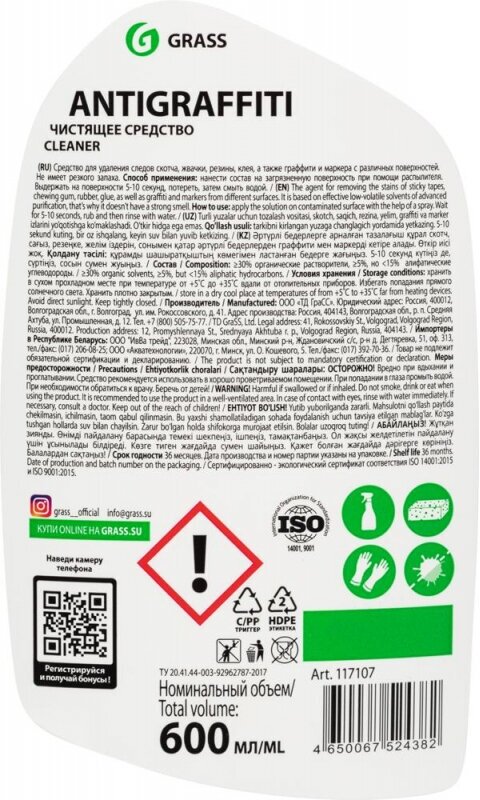 GRASS 117107 очиститель многоцелевой 600мл - antigraffiti: средство для удаления следов скотча,