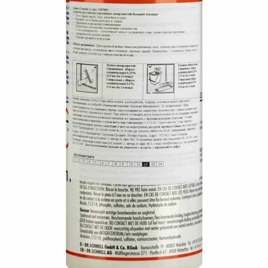 Концентрированное моющее средство для очистки стеклянных поверхностей Glasan, Dr.Schnell, объем: 1 л, pH-13,6, 143395