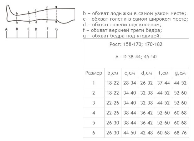 B - 25 см (3-4 размер) C - 40 см (4-5 размер) D - 42 см (4-6 размер) F - 55 см (4-5 размер) G - 66 см (4-5 размер) Получился большой разброс в размерах, от 3 до 6. Решила взять 5 размер, чтобы точно сели хорошо. В итоге на лодыжке и колене перетягивает так, что снимая вечером одна нога будто отнимается и болит лодыжка. И в течение дня сгибание ног в колене сопровождается резью. Пришлось заказать другие. Могу еще хоть как-то понять колено, потому что может там лучше подошел бы 6 размер, но уж в лодыжке то с 5 размером чулок 100% не должно никак перетягивать, учитывая, что 5 размер это с 26 см, а у меня лодыжка 25 см. Ну и как бы брать 6 размер из-за колена странно, не будет достигаться необходимый эффект компрессии, т.к. по всем остальным параметрам чулки будут велики. |