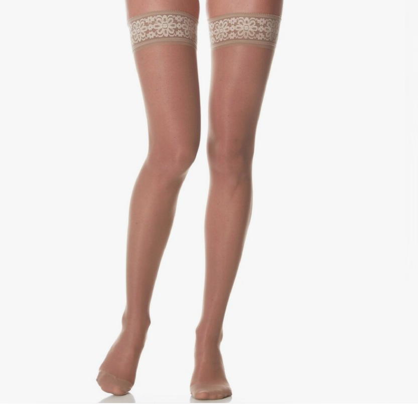 При этом выглядят как обычные современные женские чулки на красивой ажурной резинке. Причем, резинка с силиконом отлично держит на ноге, чулки не соскальзывают. |
