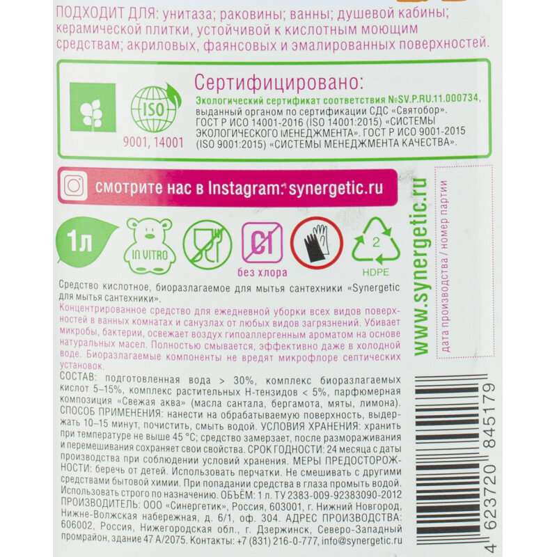 Чистящее средство Synergetic для сантехники, ванн, раковин, душевых кабин, 1 л
