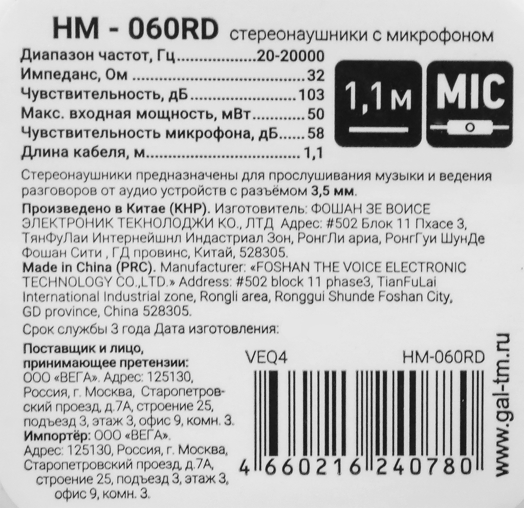 Наушники GAL HM-060RD, 3.5 мм, вкладыши, красный
