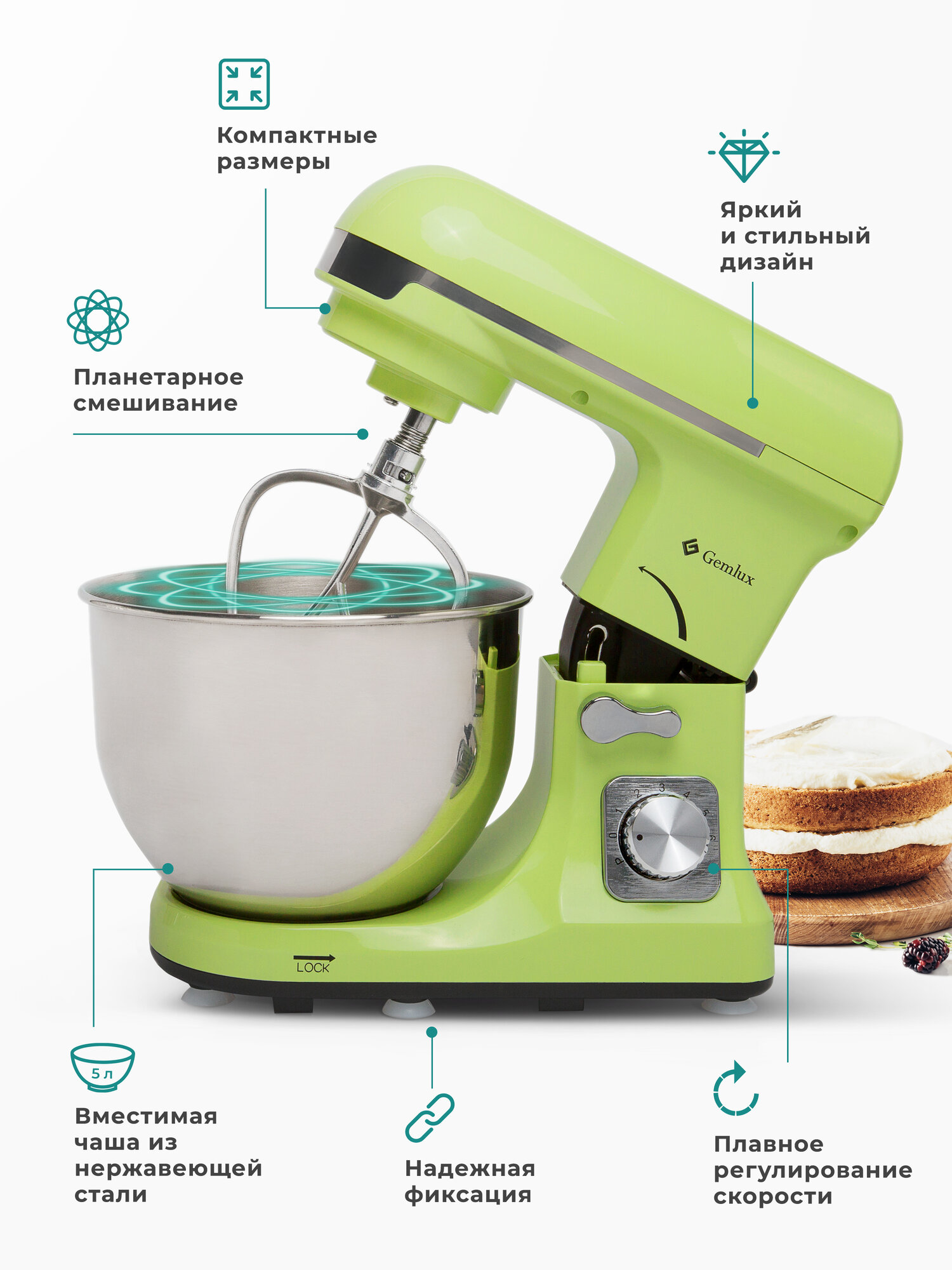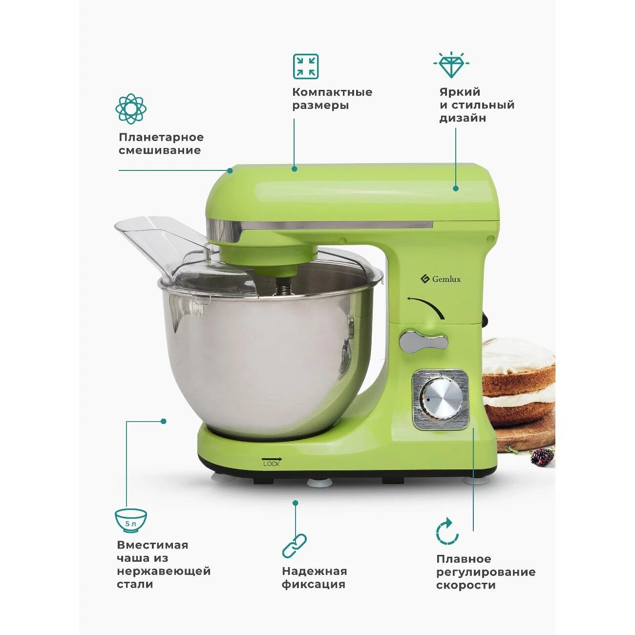 Миксер планетарный GEMLUX GL-SM5.5TB 1000 Вт, мятный