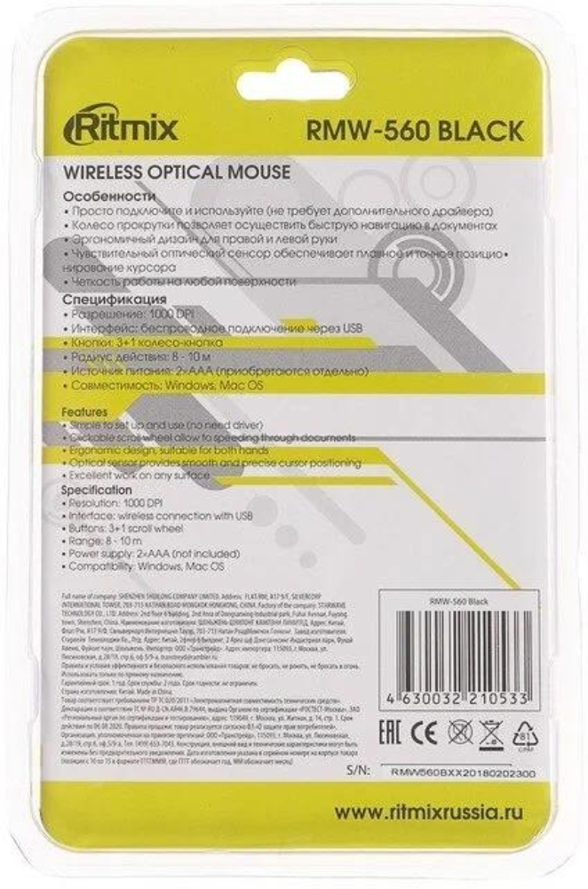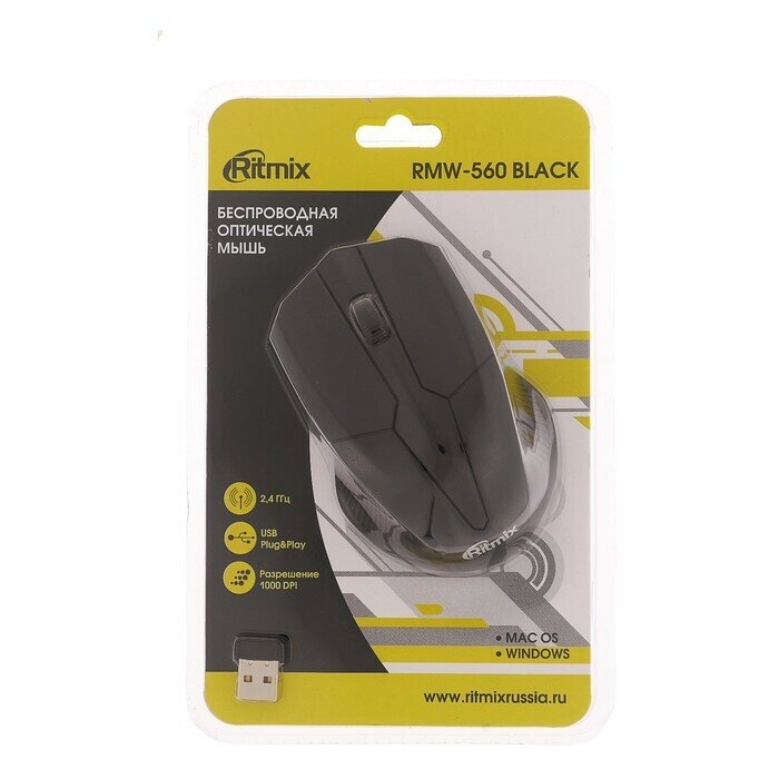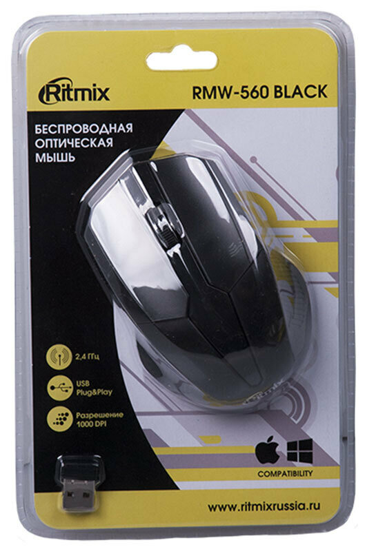 Мышь RITMIX RMW-560, черная, беспроводная, USB, блистер. Разрешение: 1000 DPI. Интерфейс: беспроводное подключение через USB. Кнопки: 3+1 колесо – кнопка. Радиус действия: 8 - 10 м. Источник питания: 2*AAA (приобретаются отдельно). Совместимость: Windows,