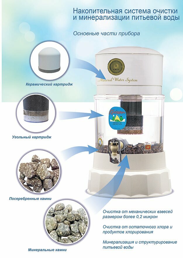Очень красиво и необыкновенно смотрятся камни на дне (они минерализируют воду и насыщают серебром), удобный краник (ребенку 2 года сам наливает) и комплекта фильтров хватает на 2 года. |