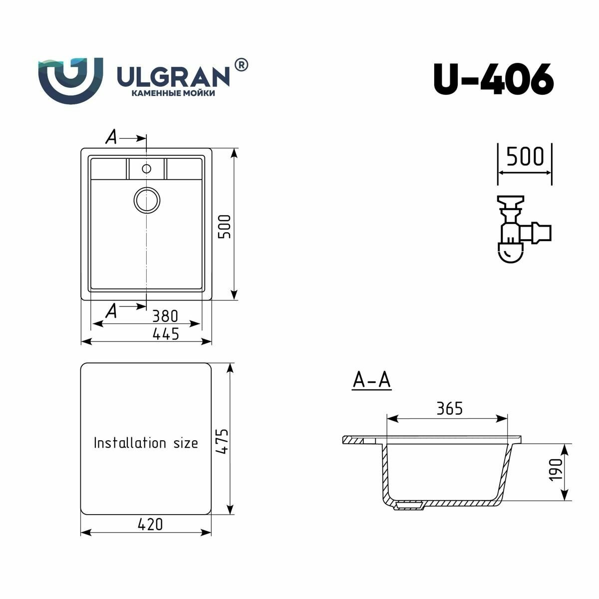 Мойка кухонная Ulgran из искусственного мрамора квадратная U-406, цвет: черный, база: 42х47.5 см, арт. U-406-308