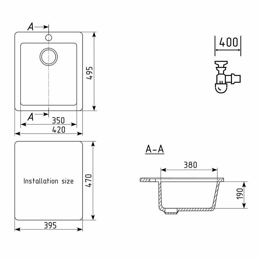 Мойка Ulgran, мрамор, U-404-308, (495*420*190 мм), черный, сифон и сливная арматура, в модуль 400