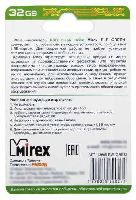 Ниже Вы можете прочитать отзывы на USB Флеш-накопитель MIREX ELF GREEN 32GB, ознакомится с подробными характеристиками, посмотреть интересные обзоры и фотографии на USB Флеш-накопитель MIREX ELF GREEN 32GB.