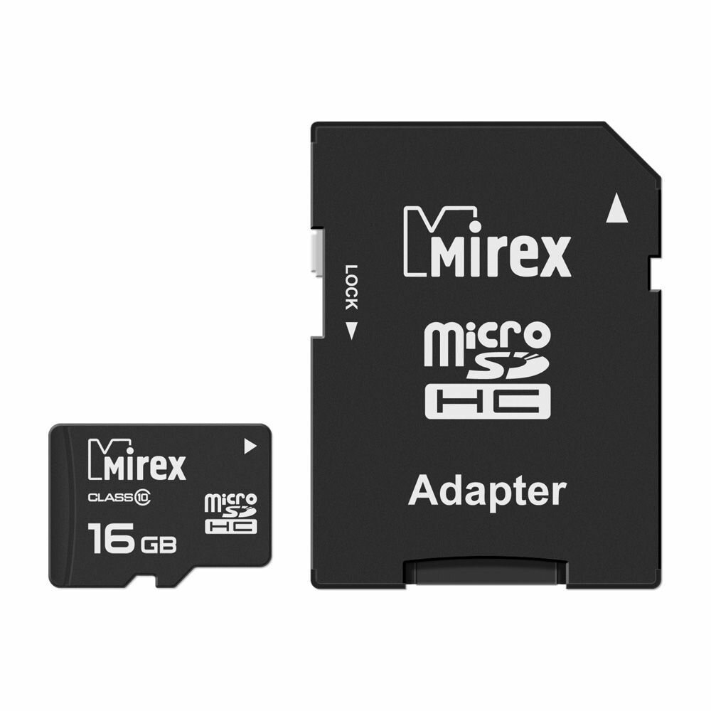 Карта памяти Mirex microSDHC 16 ГБ Class 10, R/W 25/10 МБ/с, адаптер на SD, 1 шт., черный