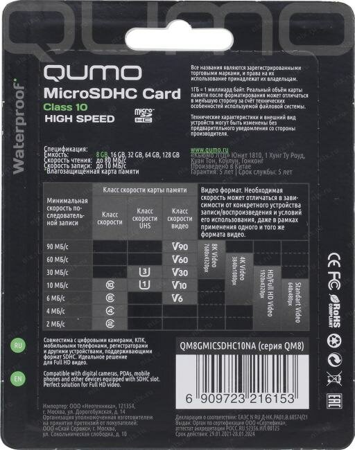 Карта памяти microSDHC 8Gb QUMO QM8GMICSDHC10NA