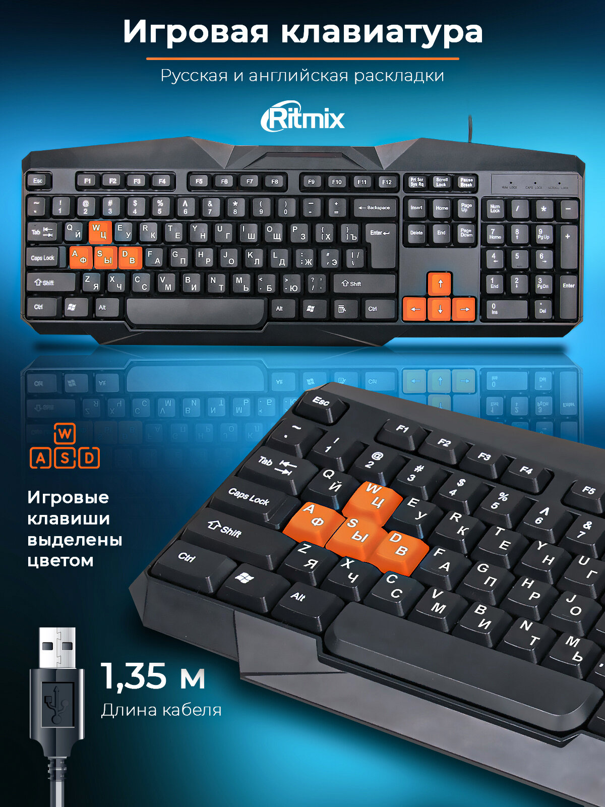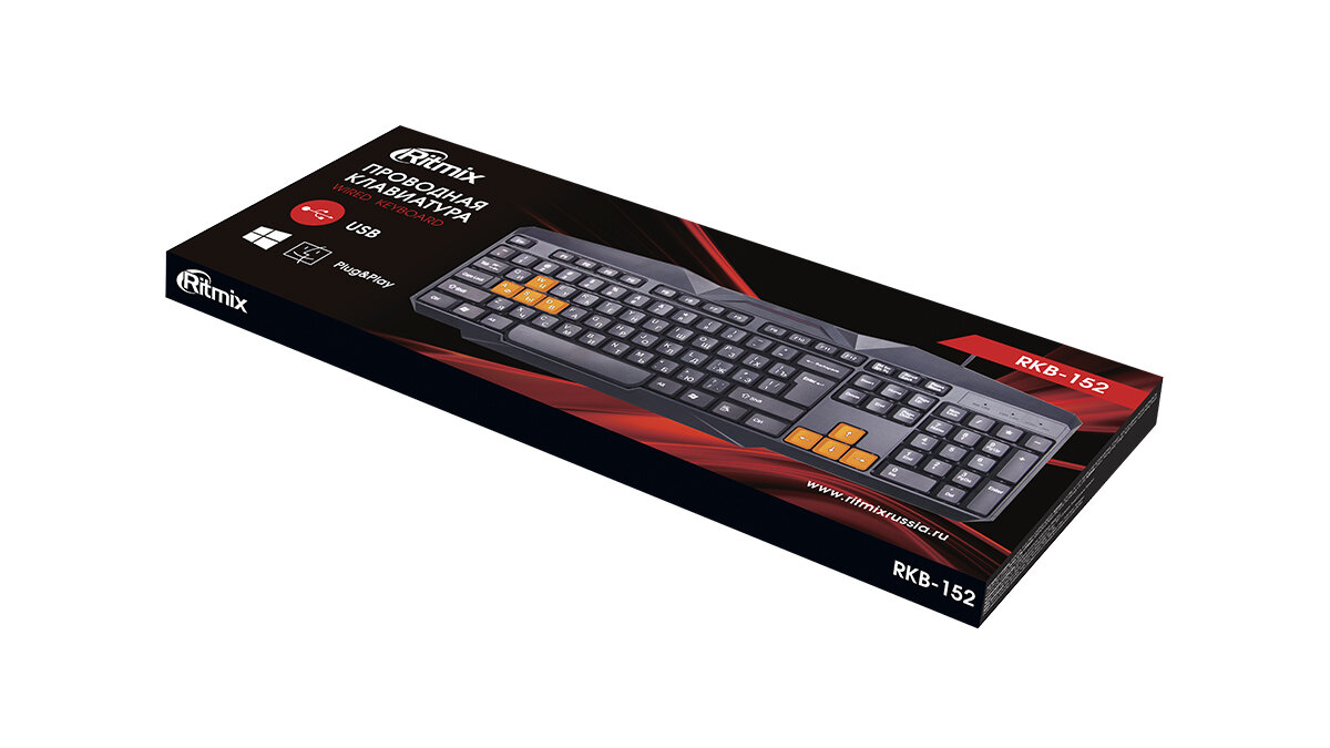 Клавиатура RITMIX RKB-152, черная/оранжевая, USB. Кол-во клавиш: 104. Длина кабеля 135 см. (1/20)