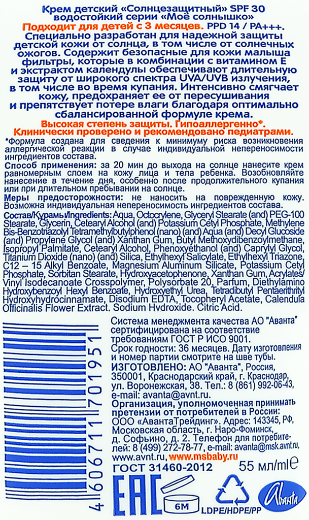 | Способ применения | за 20 минут до выхода на солнце, нанесите крем равномерным слоем на кожу лица и тела ребенка. Возобновляйте нанесение в течение дня, особенно после продолжительного купания или при очень длительном пребывании на солнце |