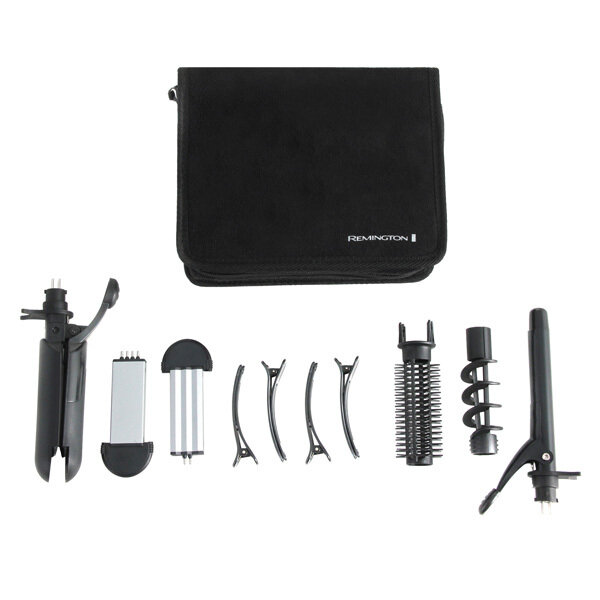 Мультистайлер Remington, включая двусторонние пластины для укладки S8670, щипцы для завивки волос диаметром 19 мм, круглую щетку и насадку для спиральной завивки, заколки для волос, черные