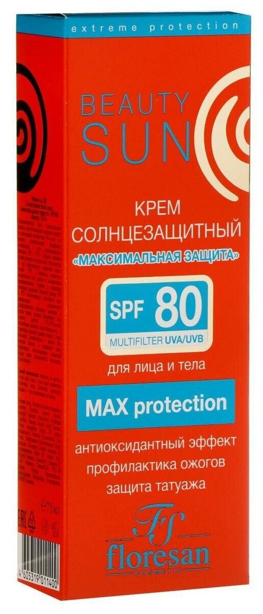 Крем солнцезащитный Максимальная защита, SPF80, Beauty Sun, 75 мл, FLORESAN