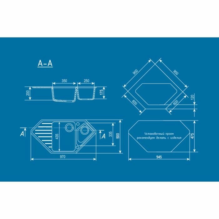 Мойка кухонная мраморная ULGRAN U-409 970*500мм угловая (309) темно-серый/Раковина для кухни
