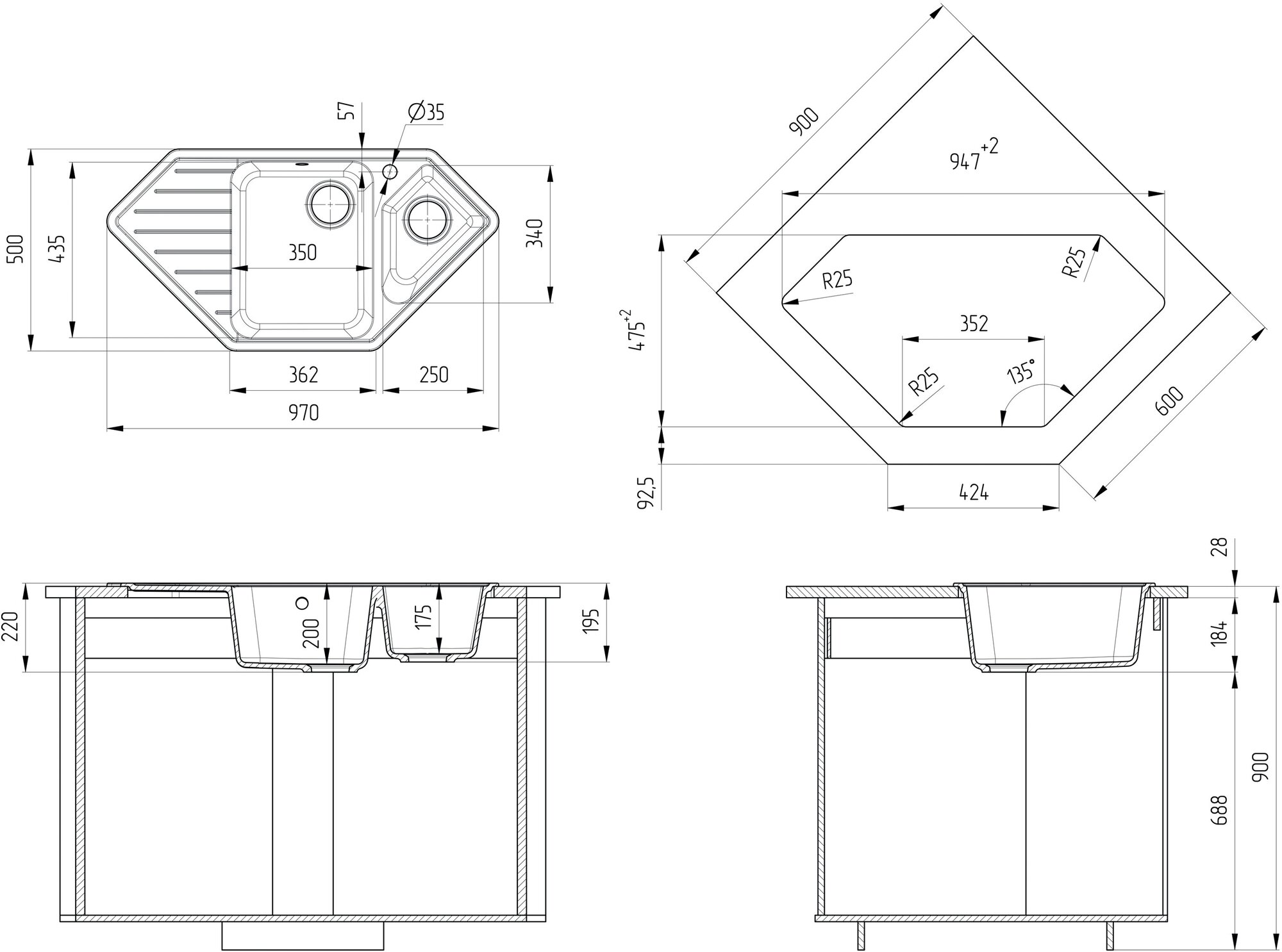 Мойка кухонная Ulgran из искусственного мрамора многоугольная U-409, цвет: графит, база: 94.5х47.5 см, арт. U-409-342