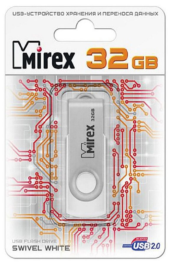 Флешка Mirex SWIVEL WHITE, 32 Гб, USB2.0, чт до 25 Мб/с, зап до 15 Мб/с, белая