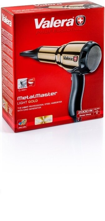 Купить Фен Valera Professional Swiss Metal Master Light (584.01/I D gold), мощность 2000 Вт, DC-мотор, суперлёгкий, ионизация, металлический корпус, холодный воздух, супергибкий сетевой шнур, диффузор, чехол для хранения