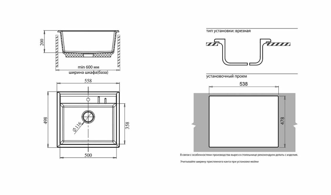 | Плюсы: | Отличная, широкая, глубокая. Что редко, отличная инструкция с размерами пропила столешницы. Смеситель тоже встал без проблем. |