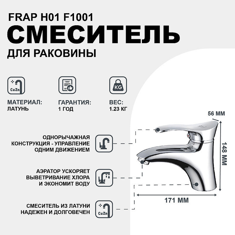 Смеситель для раковины Frap F1001, однорычажный, хром