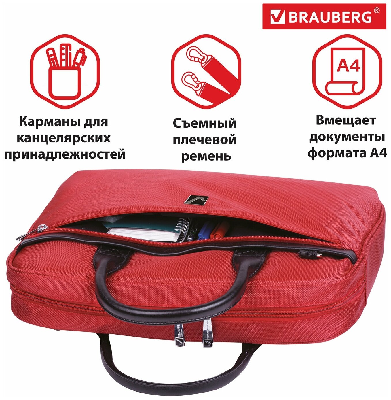 Сумка деловая BRAUBERG с отделением для ноутбука 15.6", комплект 3 шт., "Dialog", 3 кармана, красная, 40х30х7 см, 240462