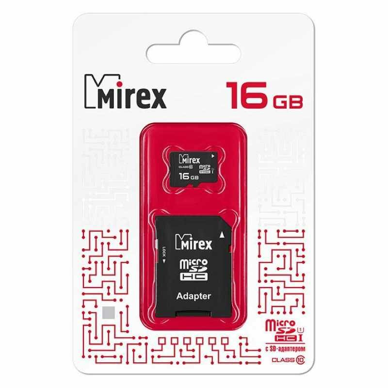 Карта памяти Mirex microSDHC 16 ГБ Class 10, V10, A1, UHS-I U1, R/W 104/45 МБ/с, адаптер на SD, 1 шт., черный