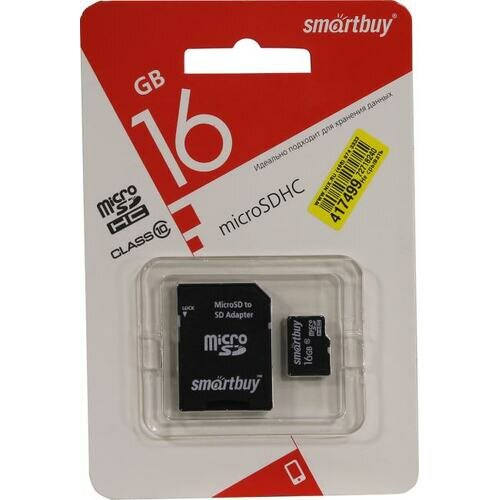 Карта памяти 16Gb MicroSD SmartBuy + SD адаптер (SB16GBSDCL10-01LE)