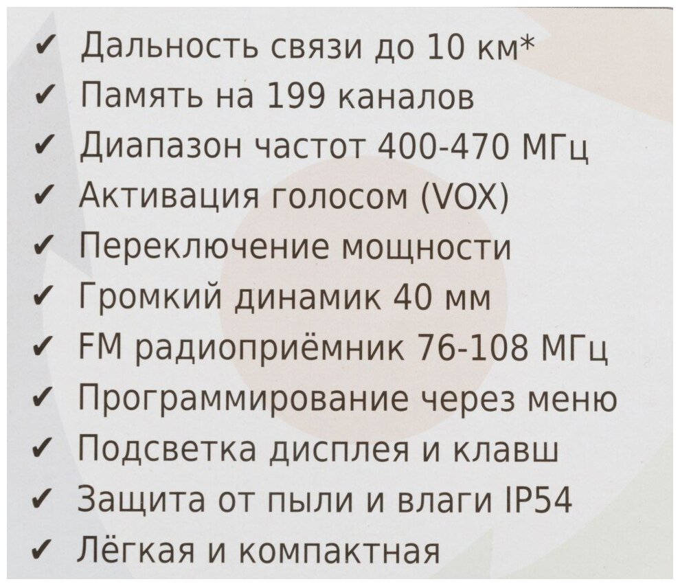 | Отзыв: | Покупал для работы на строй площадке. Основное преимущество – большое количество каналов и активация голосом. Когда руки заняты, удобно получается. Рация довольно мощная. Есть подсветка, опять же для улицы это очень хорошо. Ну и радио иногда слушаю по ней. |