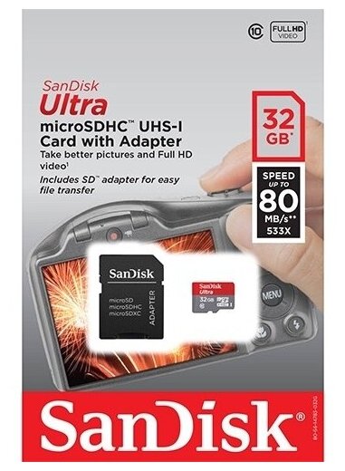 Карта памяти SanDisk Ultra microSDHC Class 10 UHS-I 80MB/s 32 GB чтение: 80 MB/s (SDSQUNS-032G-GN3MA)