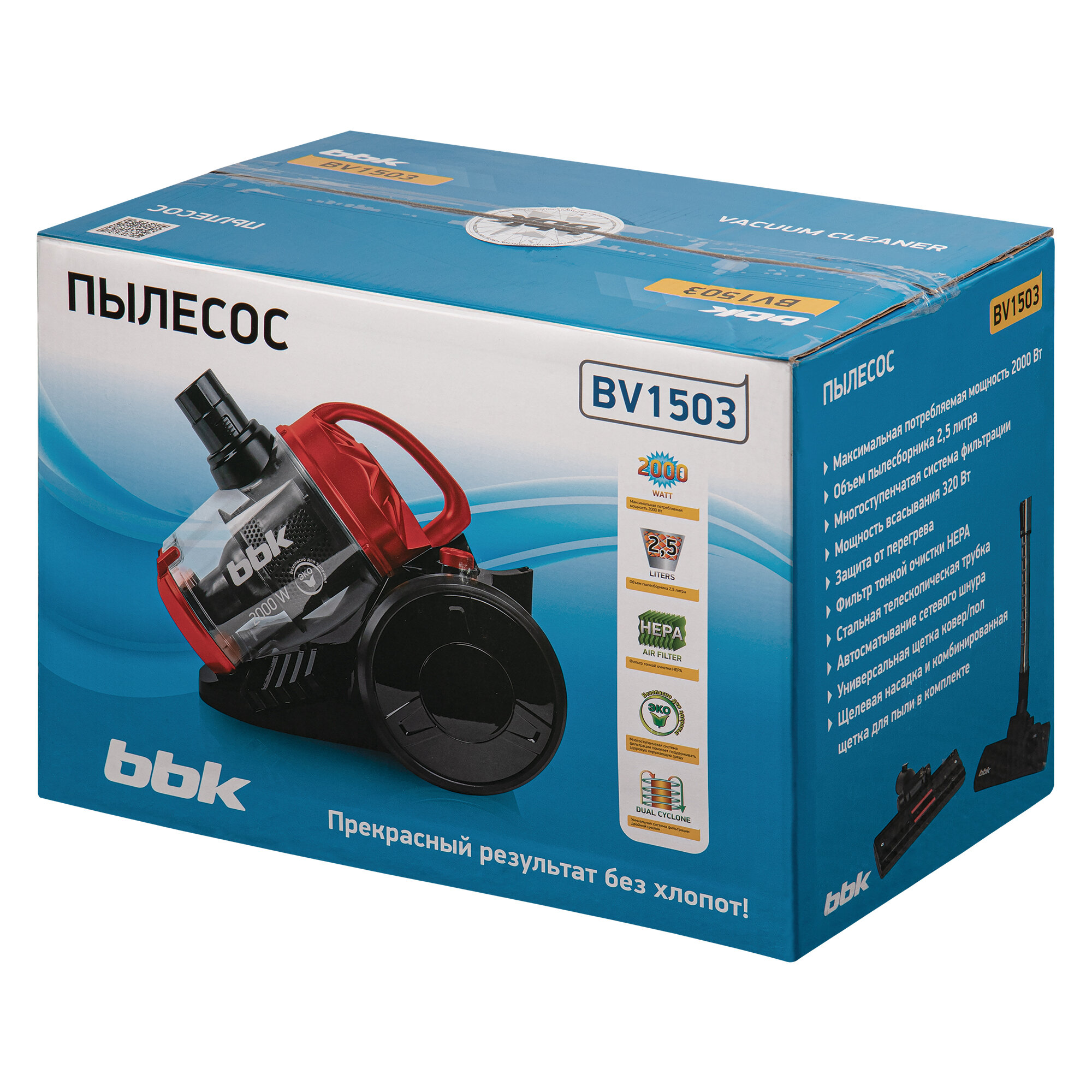 Пылесос циклонный BBK BV1503 черный/красный, мощность 2000 Вт, нера фильтр, мощность всасывания 320 Вт, объем пылесборника 2.5 л, 3 насадки в комплекте