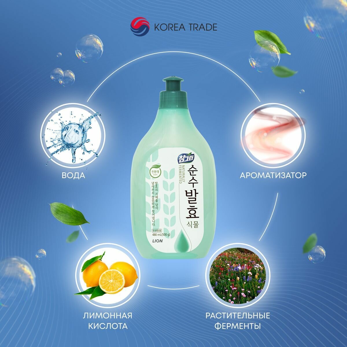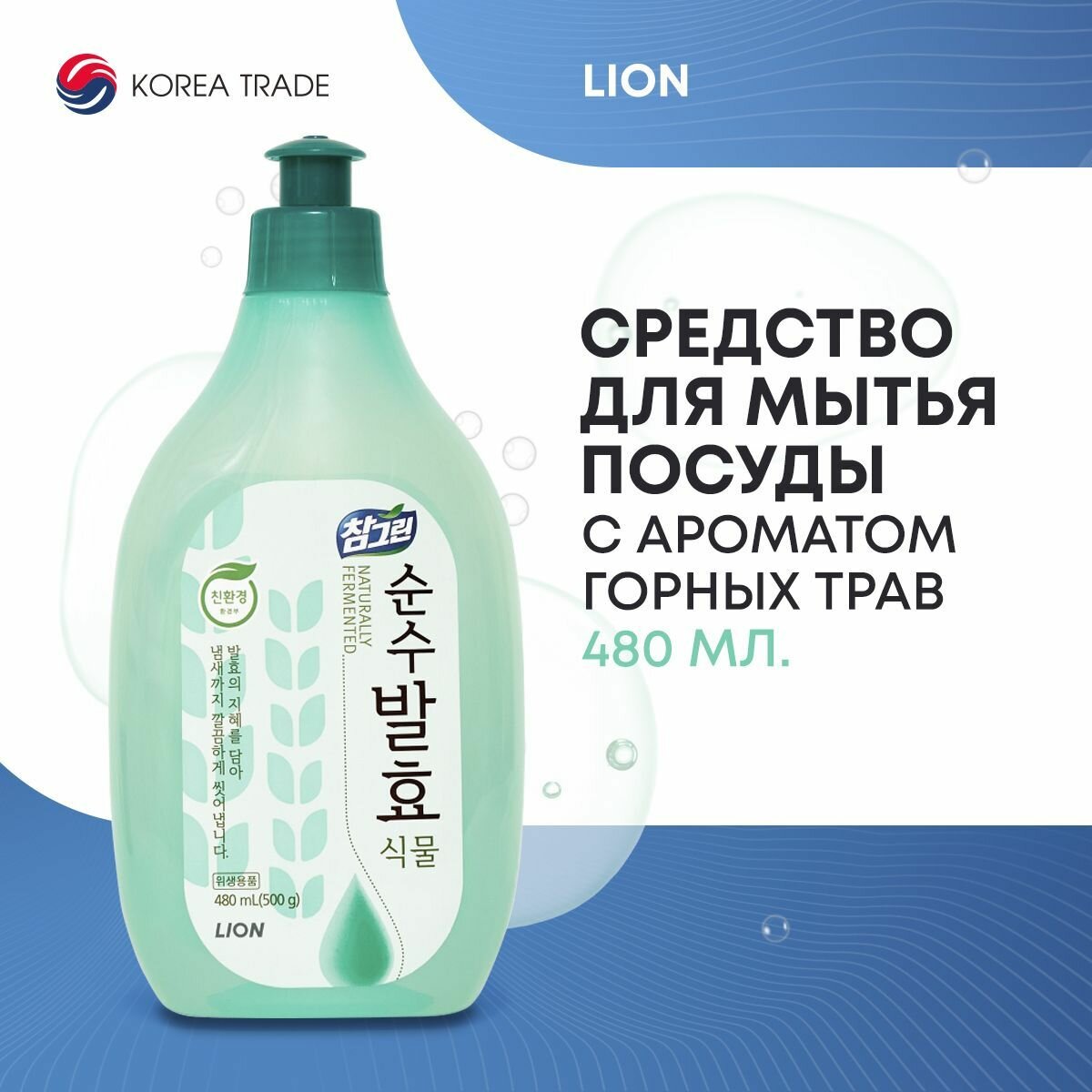 Купить LION CHARMGREEN Pure Fermentation 480ml Средство для мытья посуды, овощей и фруктов (Горные травы)