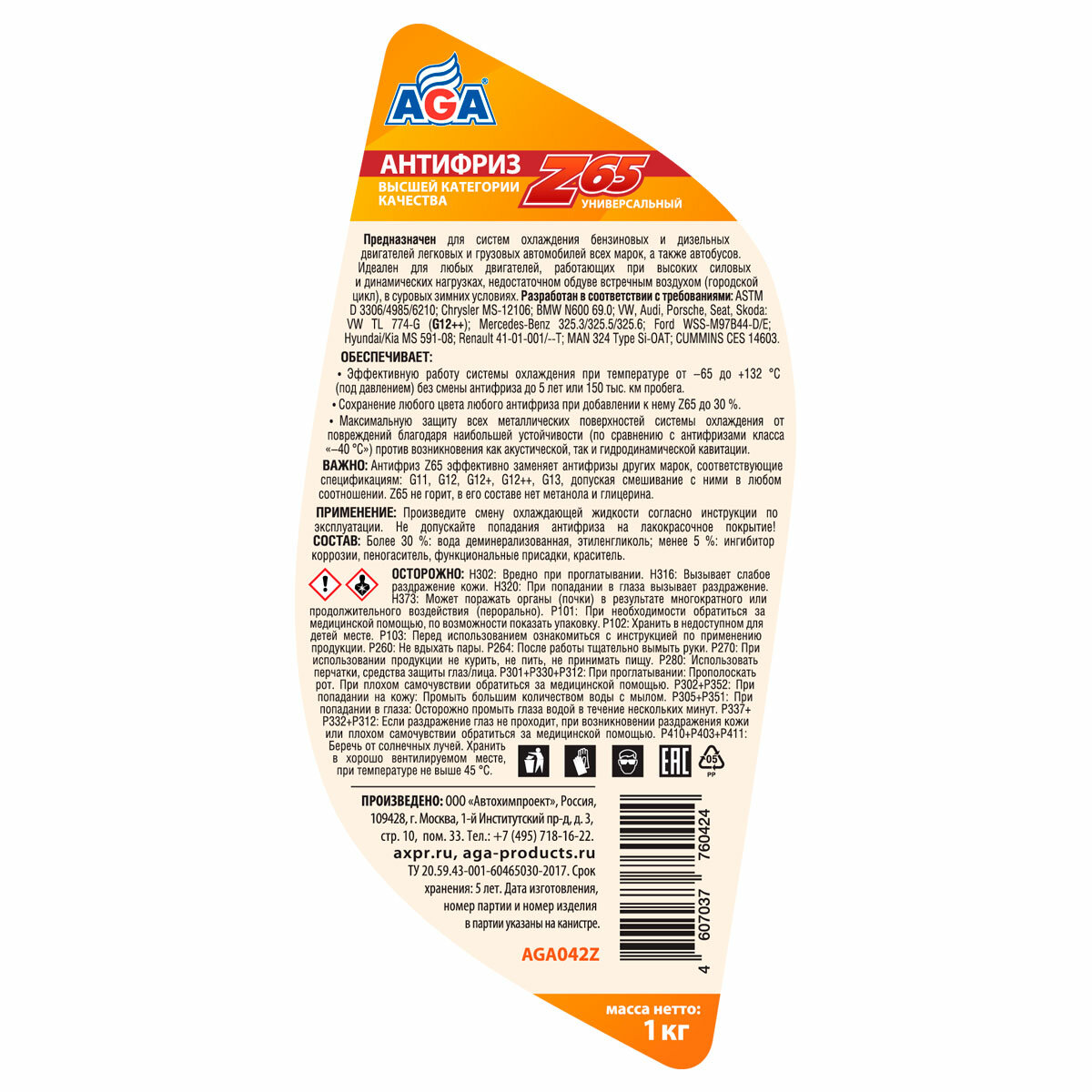 Антифриз-готовый Aga Z65 жёлтый, -65С, 1 кг, 042Z