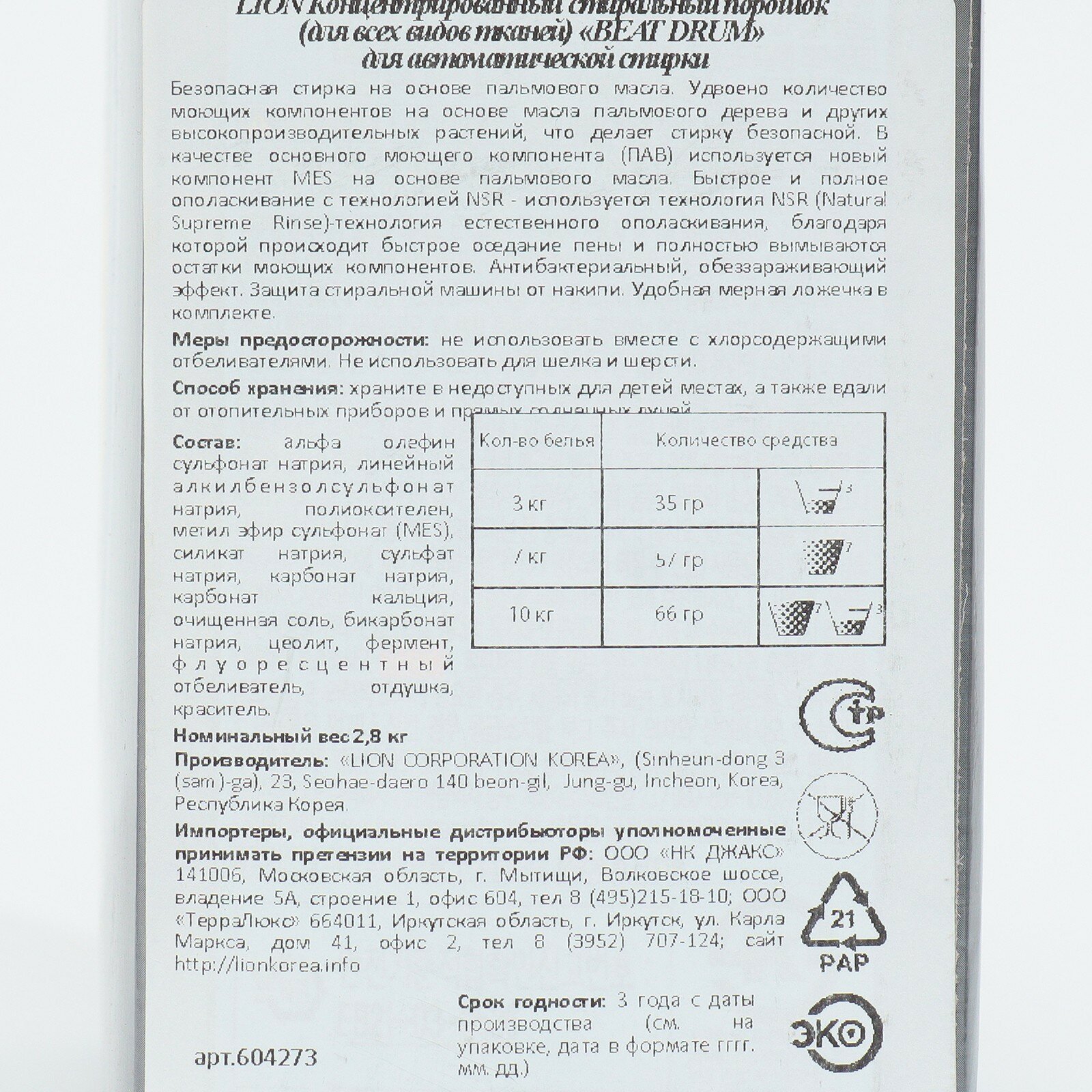 Lion Beat Drum Стиральный порошок с пальмовым экстрактом автомат 2,8 кг в в коробке на 49 стирок