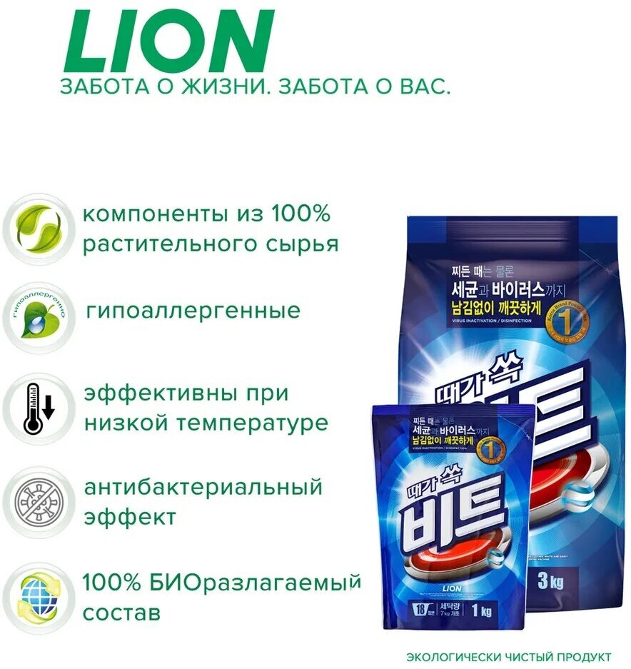 LION BEAT 1kg (Pouch) Концентрированный стиральный порошок для ручной и автоматической стирки (для в