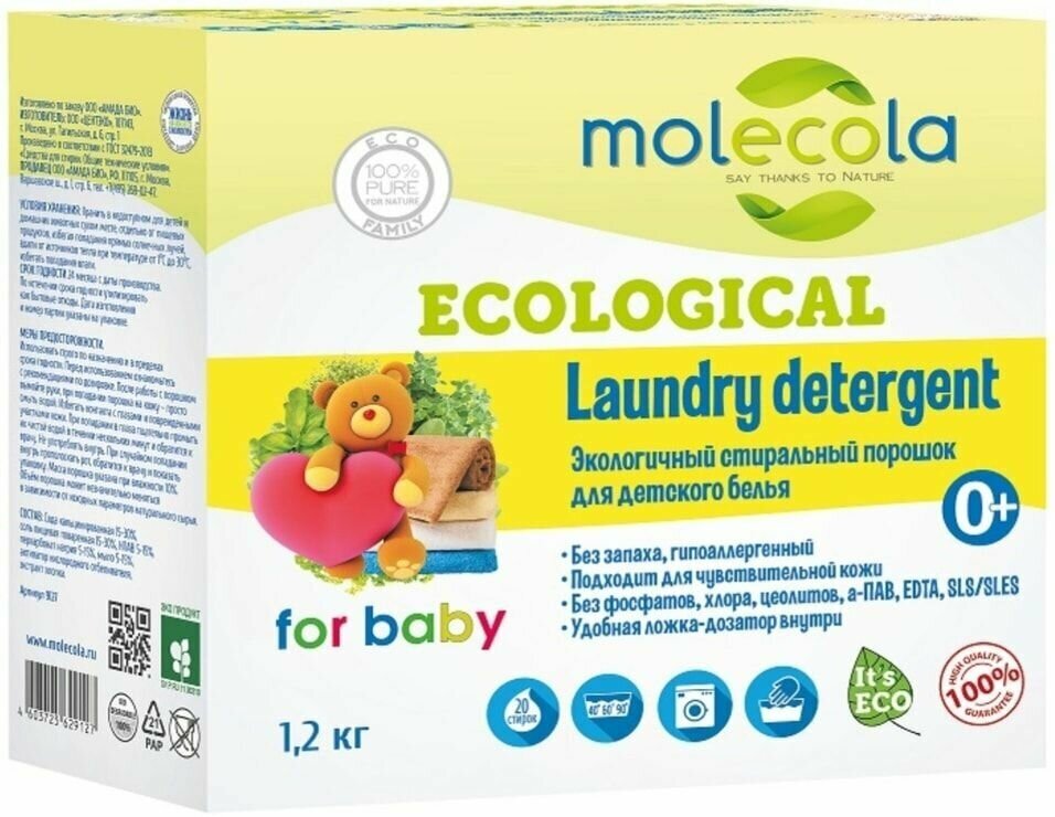 MOLECOLA Экологичный ст-ный порошок с рас-ми энзимами д/стирки белого и цветного детского белья 1,2кг