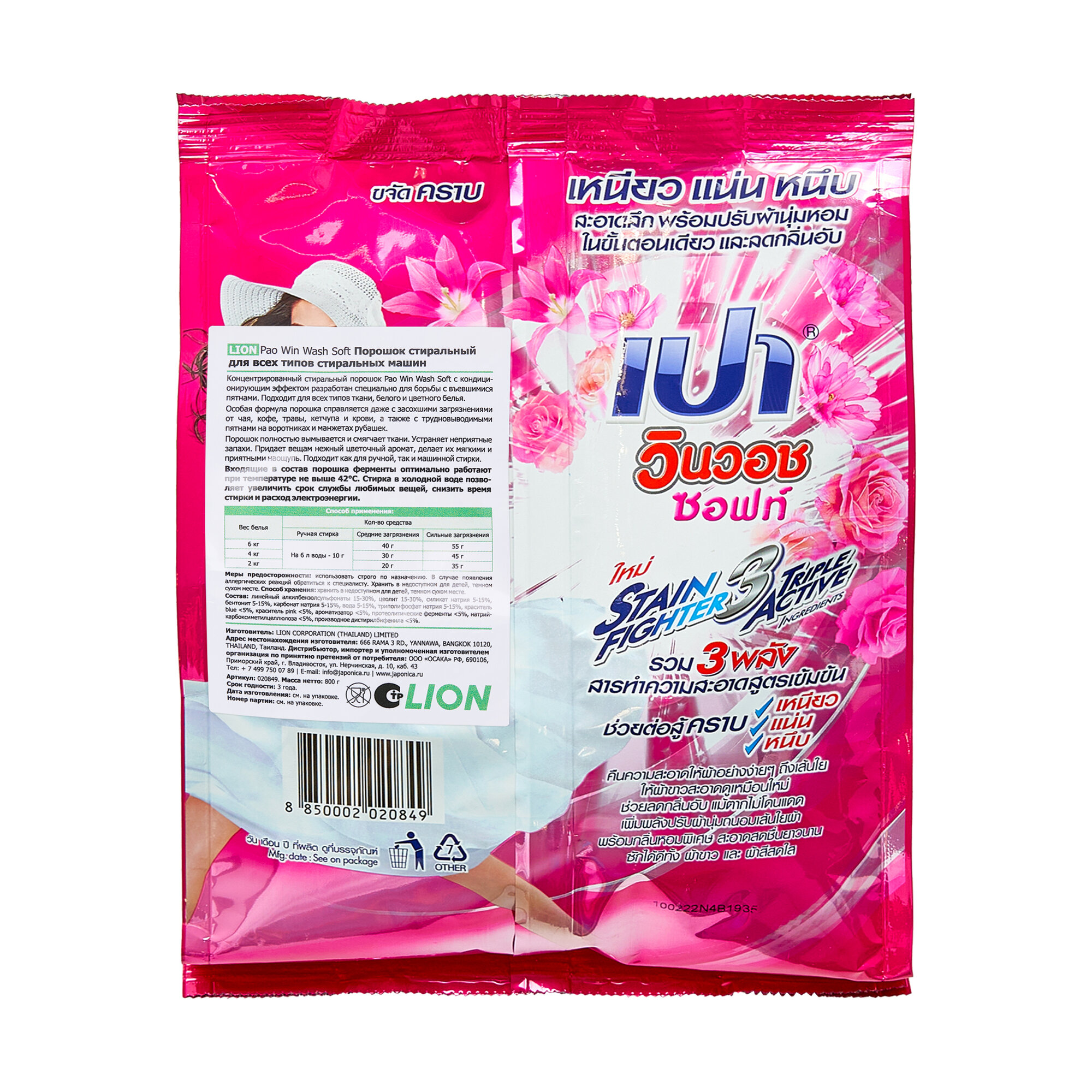 LION Thailand Pao Win Wash Soft Порошок стиральный для всех типов стиральных машин 800 г