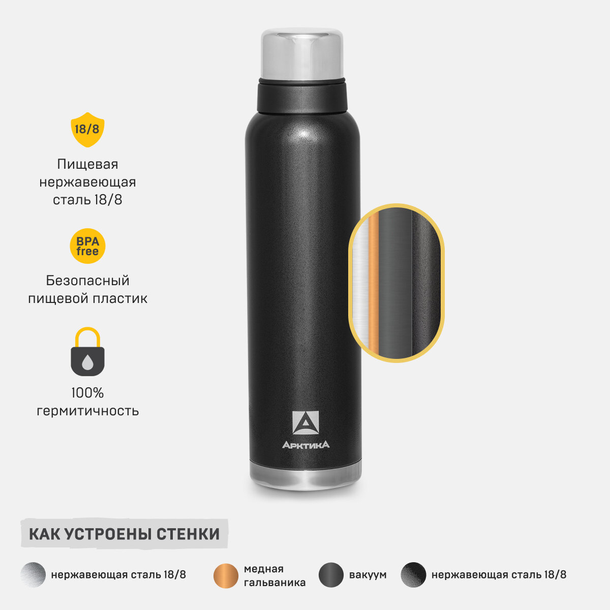 106-750 Черный Арктика Термос бытовой, вакуумный (для напитков), 750 мл