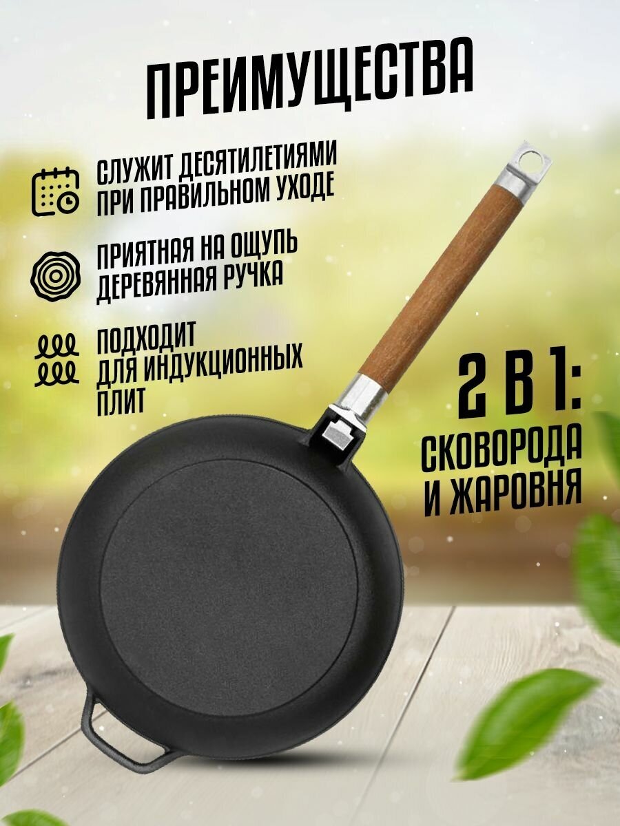 | Плюсы: | Просто чугунная сковорода, съёмная деревянная ручка. Работает с индукционной плитой. |