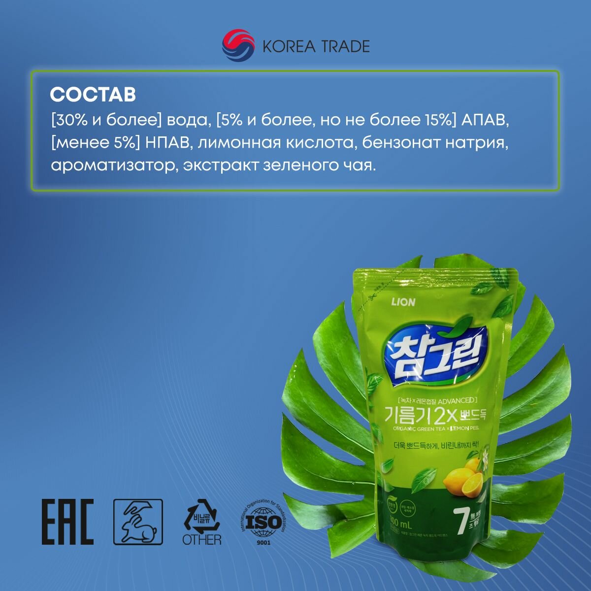 Средство для мытья посуды Lion Chamgreen Зеленый чай, мягкая упаковка с колпачком, 1.2 л
