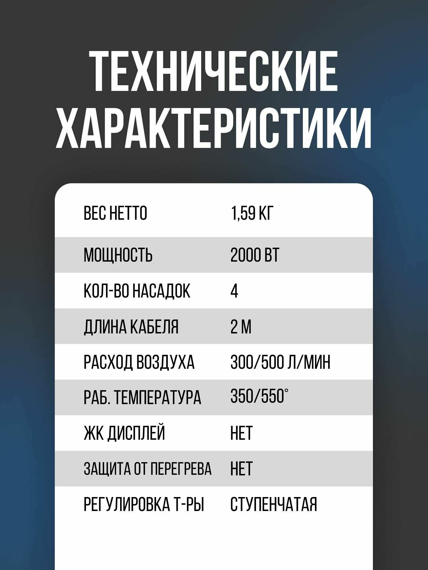 | Дополнительная информация | 2 режима работы - 350 °C, 300 л/мин; 550 °C, 500 л/мин; рукоятка с прорезиненным покрытием; шпатель; длина кабеля: 2 м |
