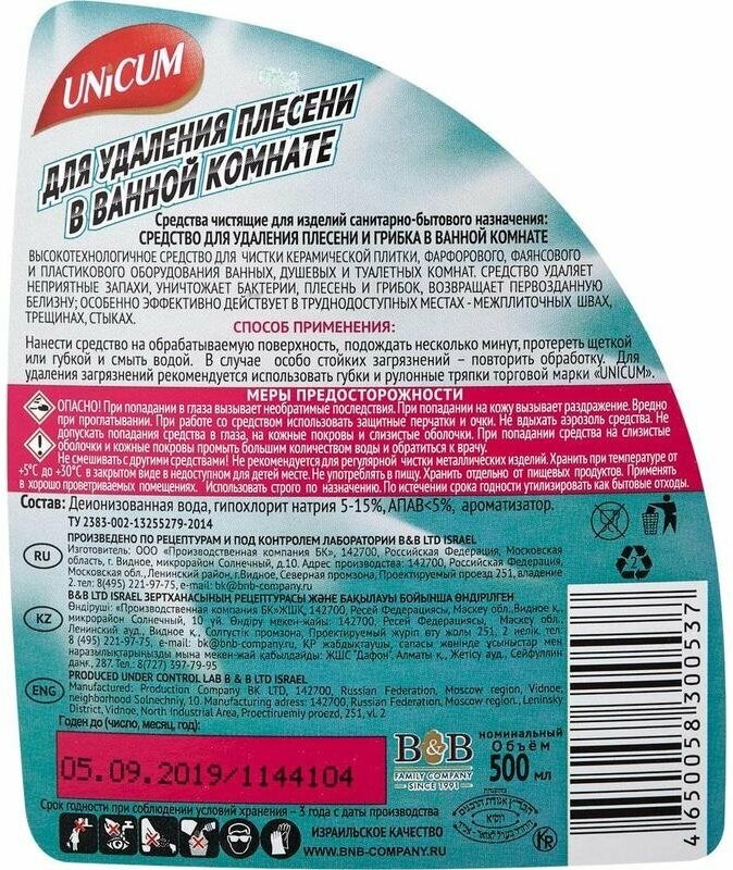Чистящее средство 500мл UNICUM (Уникум), для удаления плесени в ванной комнате, спрей, ш/к 00537