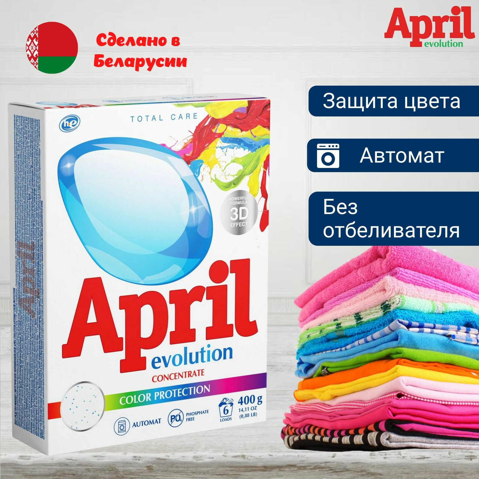 Ниже Вы можете прочитать отзывы на April Evolution Стиральный порошок April Evolution, Color, Protection, автомат, для стирки цветного белья, 400 г, ознакомится с подробными характеристиками, посмотреть интересные обзоры и фотографии на April Evolution Стиральный порошок April Evolution, Color, Protection, автомат, для стирки цветного белья, 400 г.
