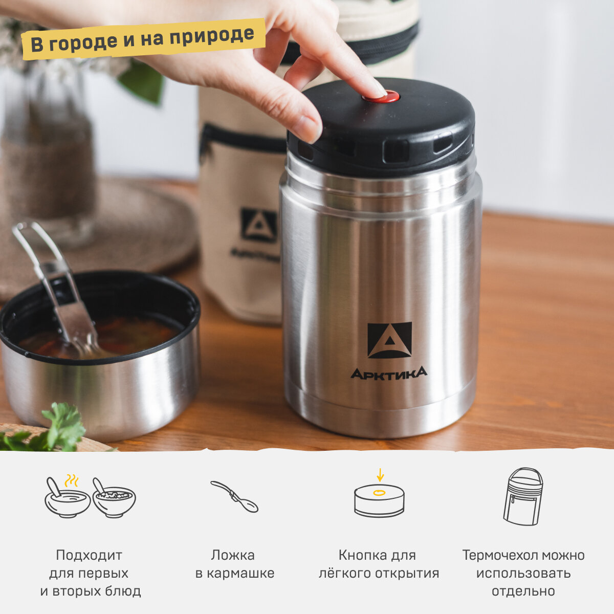 Термос для еды и супа Арктика 301-750А серебристый 0,75 литров со складной ложкой и чехлом в комплекте