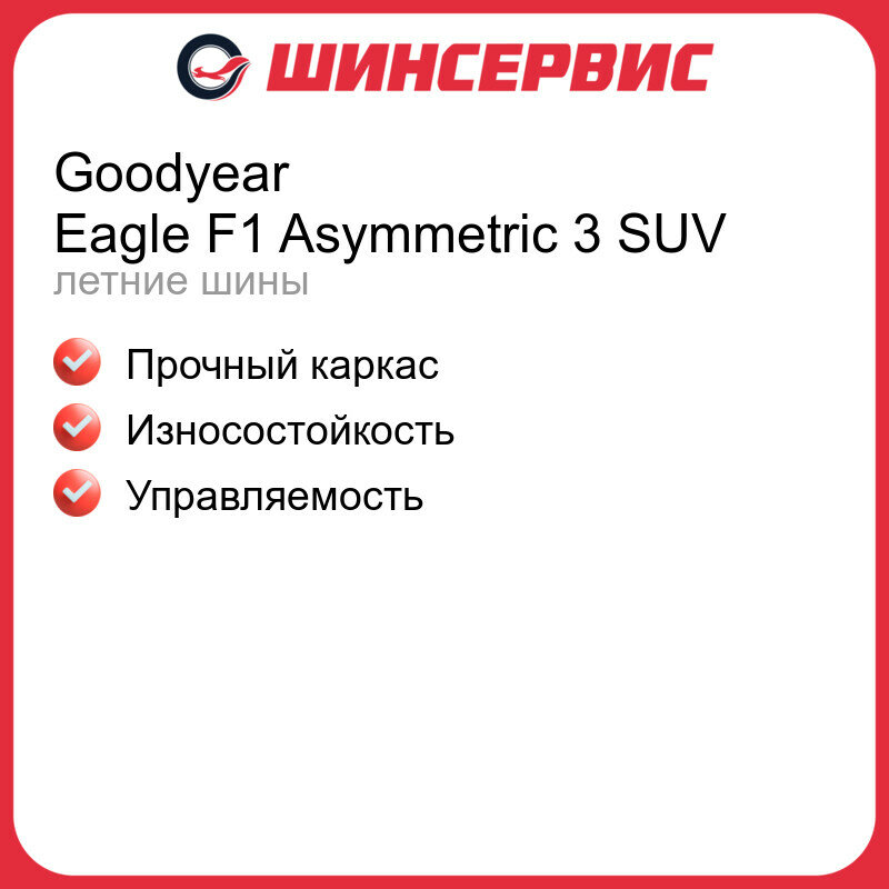 | Отзыв: | Пришло время поменять резину на лето, и я решил взять Goodyear Eagle F1 Asymmetric 3 SUV Так как заинтересовали заявленные характеристики. R17 устанавливал на ауди Q3 . Однозначно стоят своих денег. |